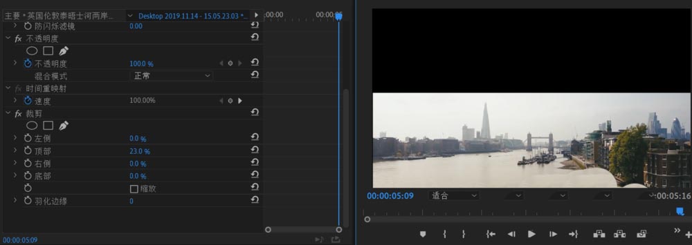 3、我们在左上方的效果控件面板中找到裁剪,对它的顶部和底部进行裁剪,还可以对他进行一定程度的羽化