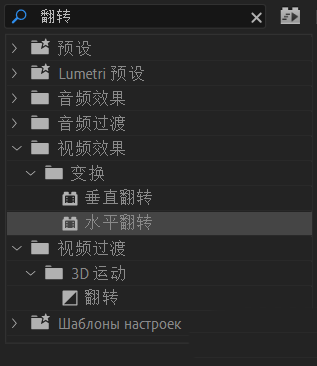 5、在效果面板中,我们输入翻转找到水平翻转效果,拖拽应用到我们复制的视频(v2)之上
