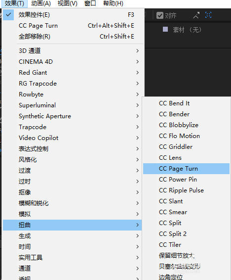 4、接下来添加效果了,找到“效果—扭曲—CC Page Turn”,然后把效果添加给图层