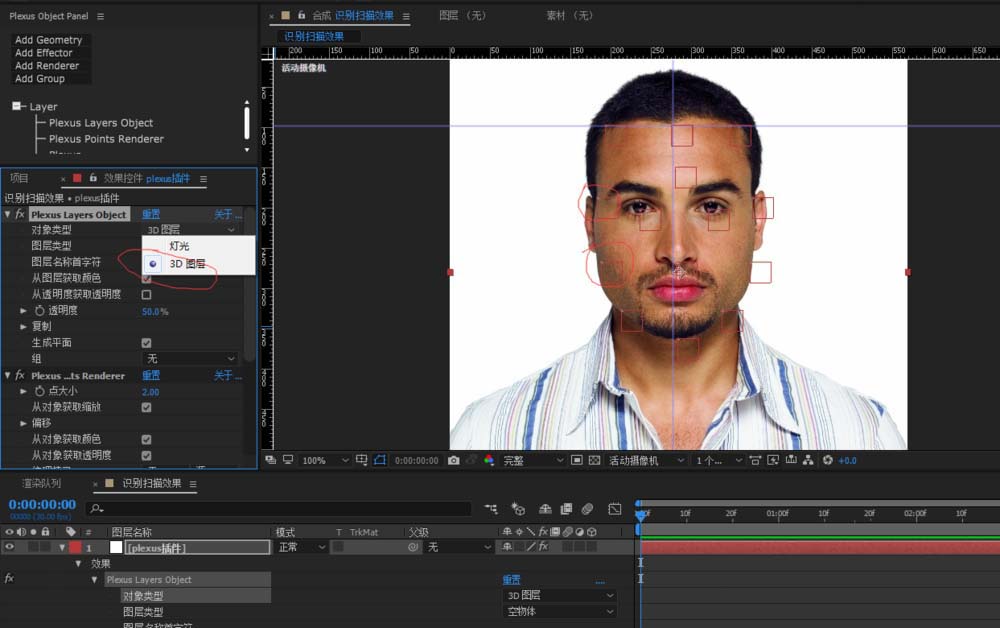 4、ctrl+y新建一个纯色层,添加plexus插件;这是一个外部插件,要自己下载安装;