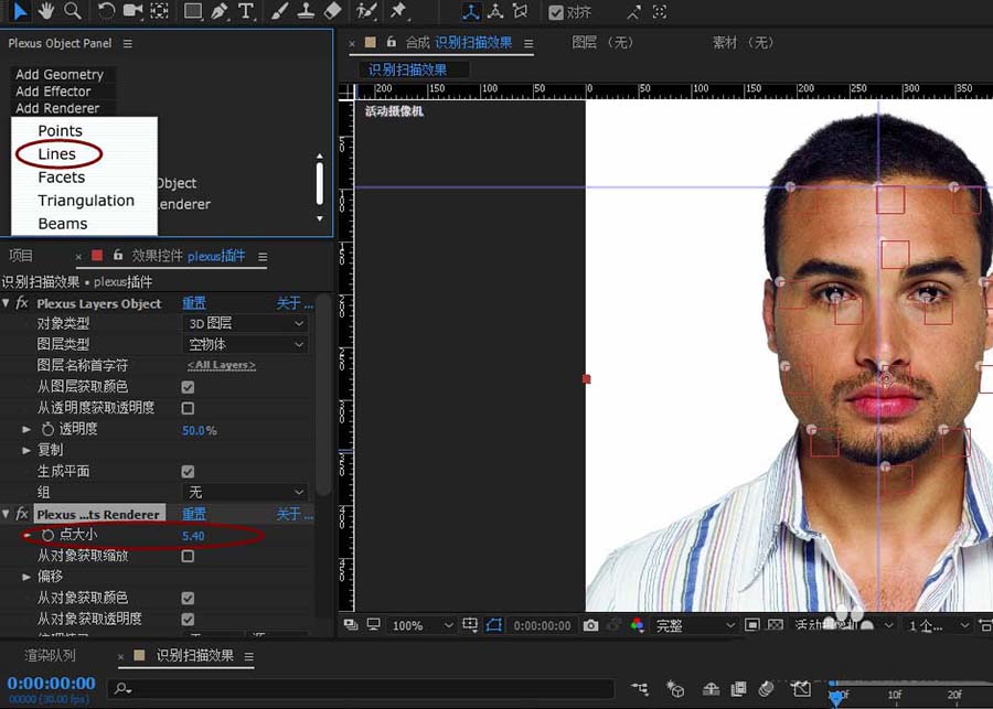 7、通过以上小编分享到的一些参数我们来通过给点和线k关键帧实现一个脸部识别的动画;当线有了,我们还可以进一步的去渲染它的三角面;同样跟三角面的最大距离k关键帧,实现总体识别效果;