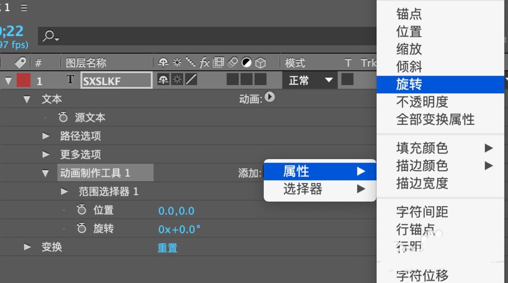 3、在动画制作工具右边,添加属性选择旋转。