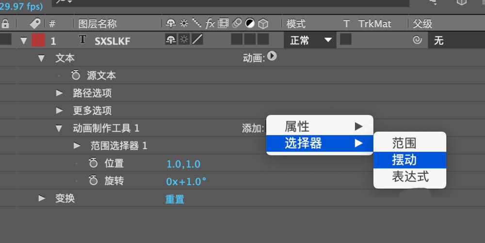 5、然后在动画制作工具右边,添加选择器选择摆动。