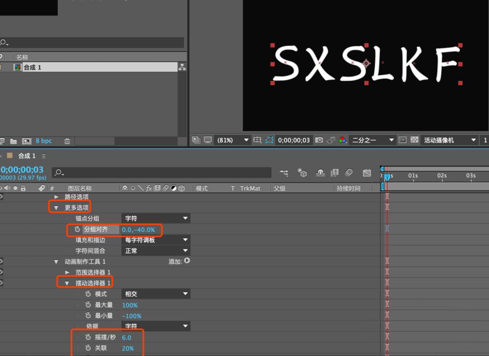 6、摆动选择器里将摆动的时间更改为6秒,关联20%左右。更多选项中分组对齐选择-40%左右。