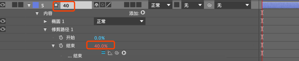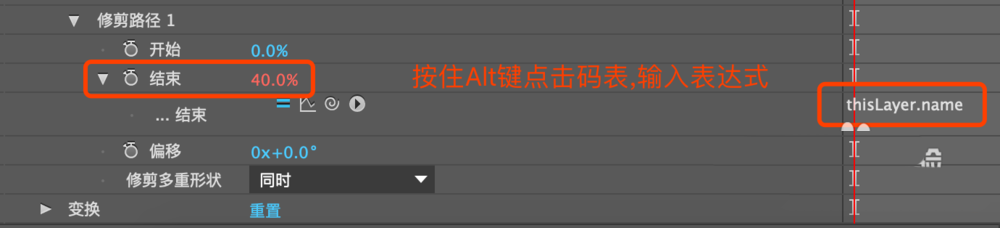 5、在修剪路径下方的结束处,输入数值40,在左边的码表处按住Alt键,调出表达式,输入:thisLayer.name,确定.