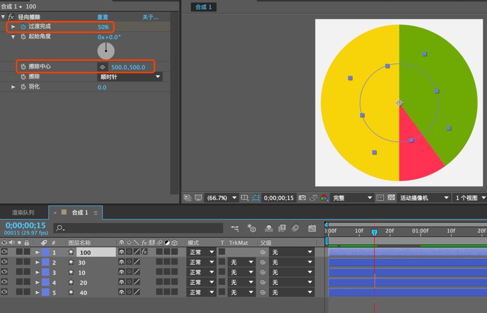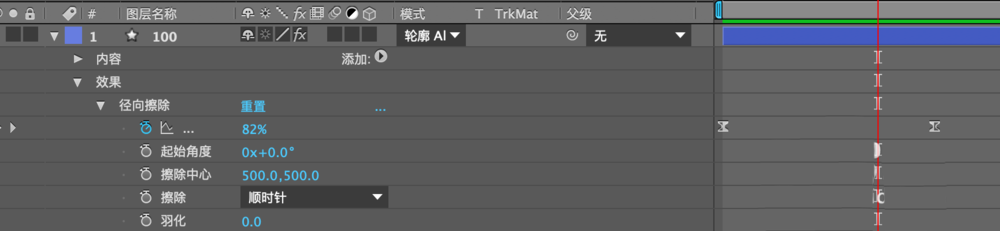 10、给径向擦除打关键帧动画.擦除中心数值和其他图层一致。