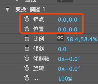 3、在变换:椭圆1一栏将锚点和位置设置为0。