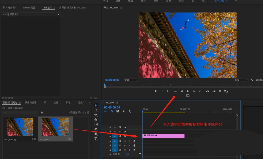 1、选择素材对象导入到PR项目中,然后根据导入的素材对象来创建一个剪辑序列。