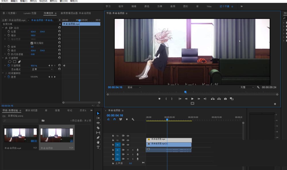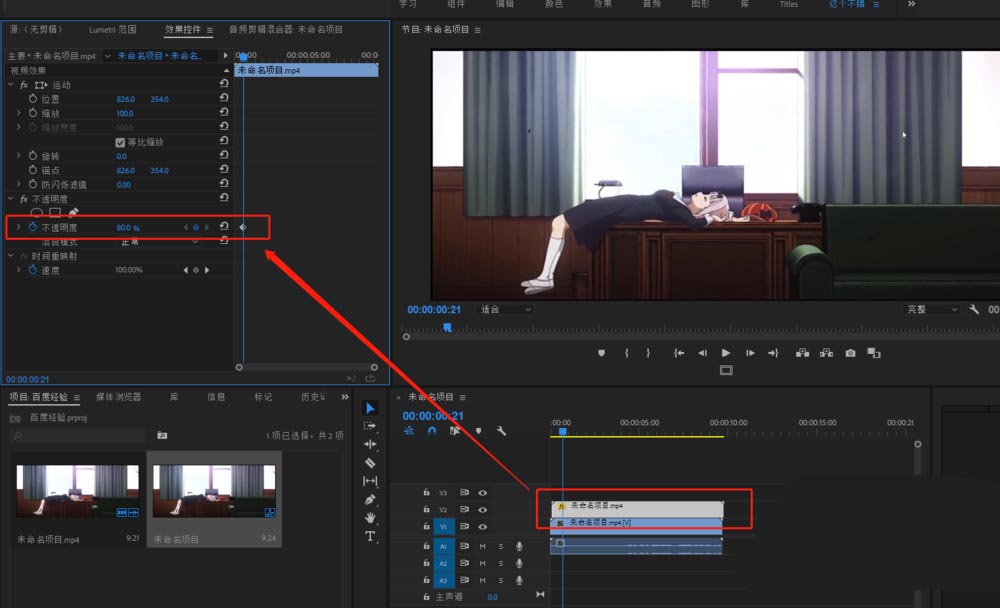 4、选中向后移动3帧后的视频轨道2的视频素材,打开效果控件窗口,设置其不透明度为80%。