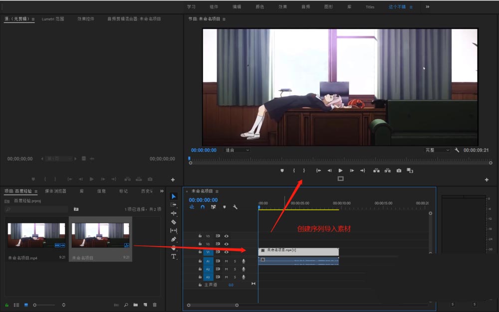 1、在PR软件中新建一个序列,然后导入素材并应用到序列中去。