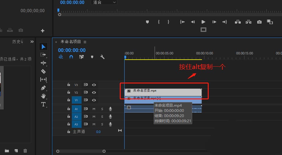 2、将视频的音视频进行分离,然后单独选中视频轨道的视频文件,按住alt键进行复制一个到视频轨道2.