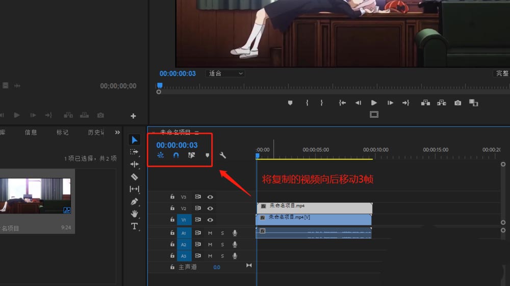3、将时间轴指针向前进3帧,并将复制的视频素材整体向右移动3帧。