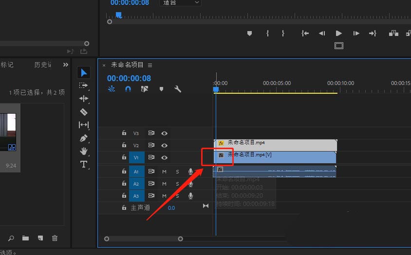 5、将原来的视频轨道1的视频素材前面3帧裁剪掉,这样两个视频素材就对齐了。