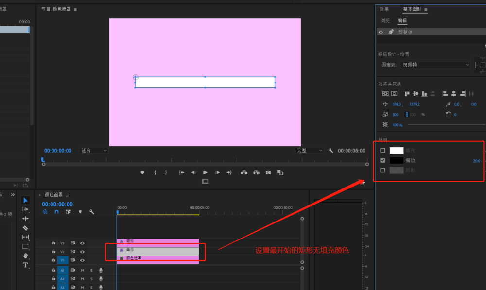 4、选择原来的视频轨道2的矩形,在基本图形设置中,设置其无填充颜色,并设置描边颜色为黑色,数值为20.