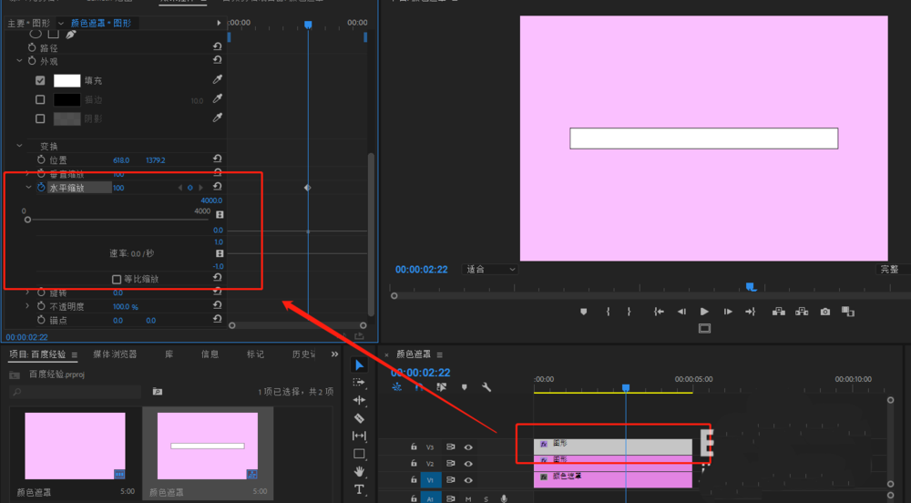 5、将时间轴移到中间位置,然后选中视频轨道3的矩形并打开效果控件,去掉等比缩放勾选找到水平缩放,并打入一个关键帧。
