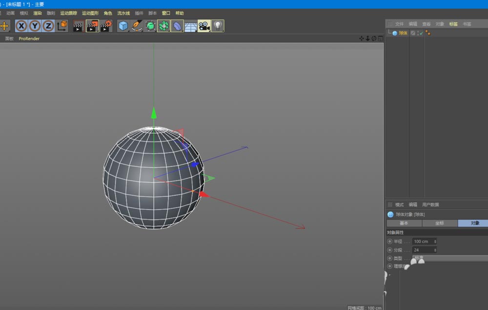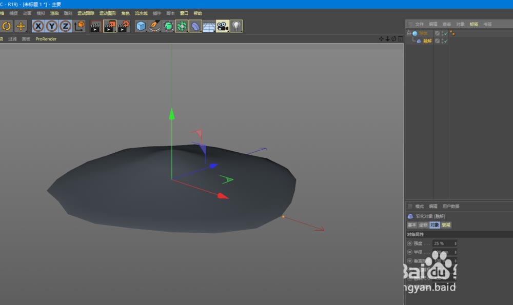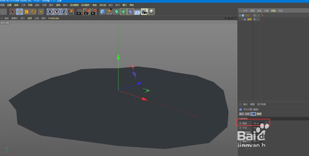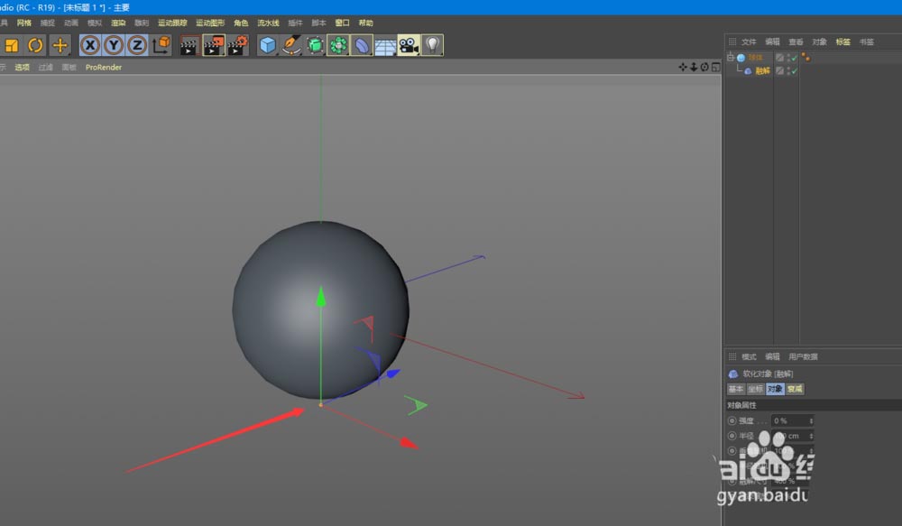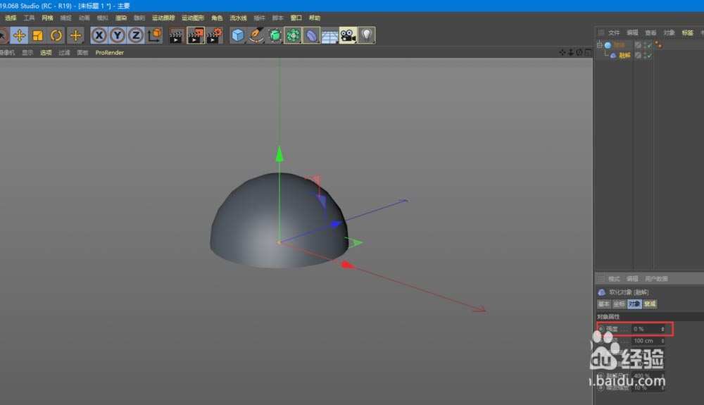 5、当强度为0 的时候,我们看到的只是一个完整的半圆,那怎么样才能恢复成完整的正圆呢?只需要把球体的坐标拉至球的下方即可显示完全的球体;