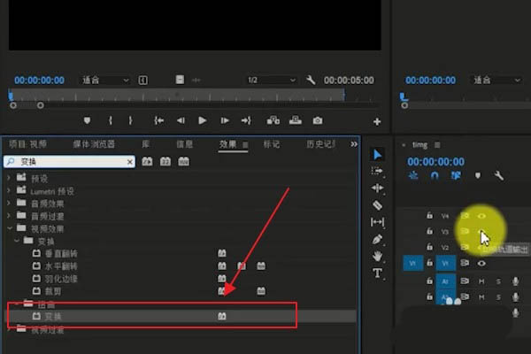 3、然后我们在【效果】中选择【变换】功能添加给V2轨道的图片素材。