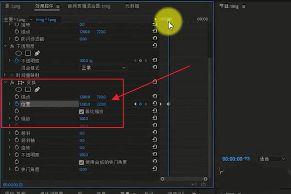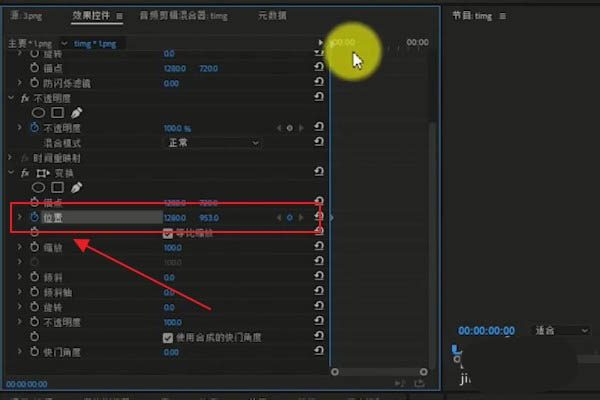 4、我们在【效果控件】中找到【位置】,添加关键帧,然后将位置坐标调低一点点。