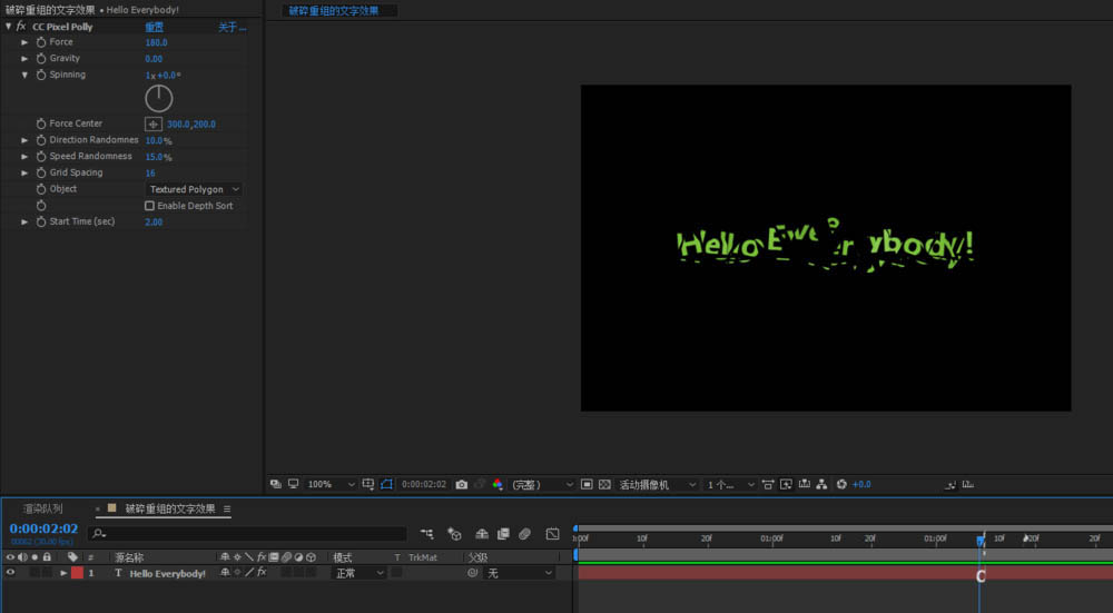 2、ctrl+t输入自己想要的文字效果,将中心点居中,添加CC pixel polly-CC像素多边形效果;