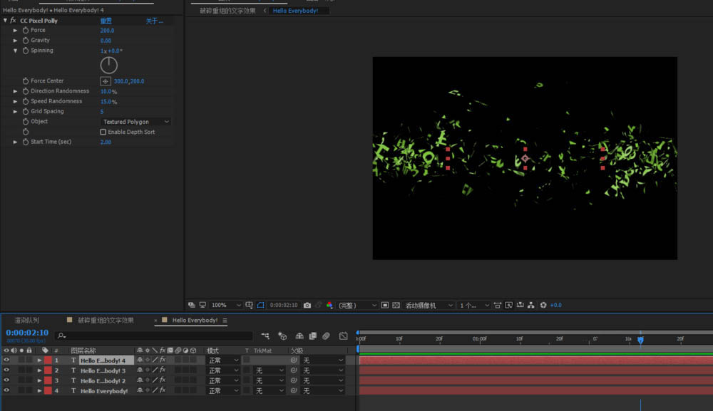 5、ctrl+t再次输入自己想要的文字同样添加CC pixel polly-CC像素多边形效果;将刚刚设置好的参数复制过来,同样将文字图层ctrl+d多复制几层,做同样的操作通过修改网格间隔参数来使碎片复杂丰富化,同样ctrl+shift+c 预合成 ;