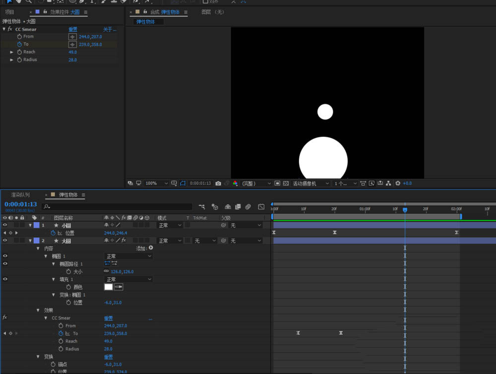 4、给大球添加CC Smear 效果,当小球下落跟大球接时,大球有一个内陷下凹的形变效果;调整好起始点和结束点,然后给结束点k关键帧,实现一个下凹效果;