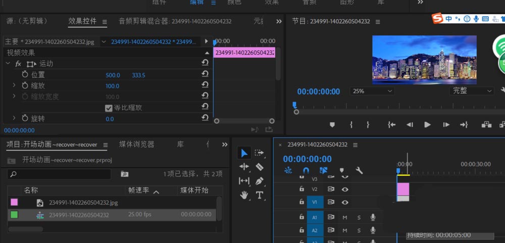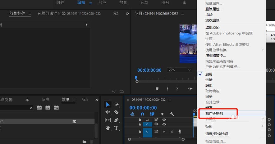 4、选中两个轨道素材右键“制作子序列”接着将子序列拖至到时间序列中,然后即可根据需要添加动画即可