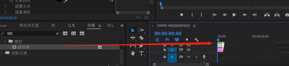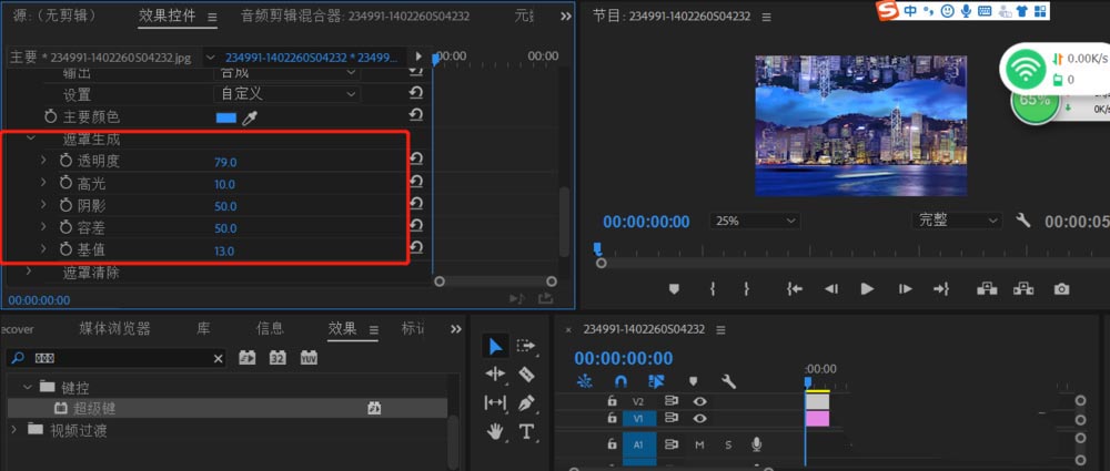 3、在效果中搜索“超级键”并应用到复制的素材中,接着“效果控件-超级键-主要颜色(选取天空颜色)-”再调整透明度和基值