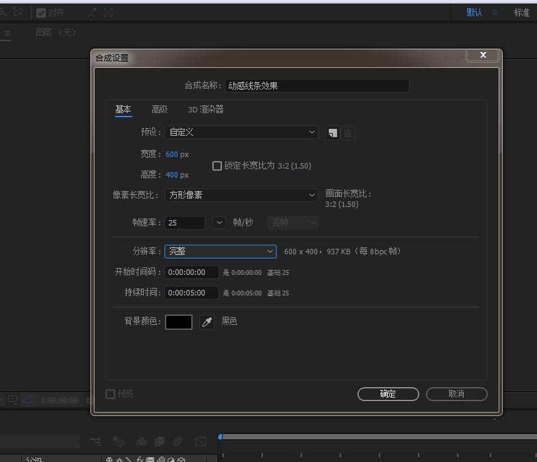 1、打开AE软件,命名动感线条效果,调整相应的参数。