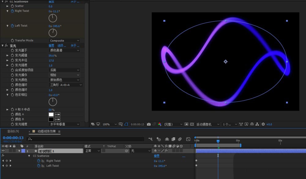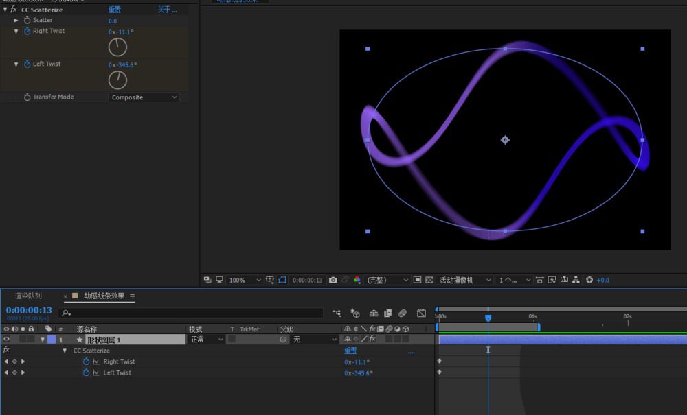 3、选中椭圆,添加 cc scatterize 效果,椭圆不需要成粒子效果,只需要做扭曲效果,扭曲成你想要的的样子就行;