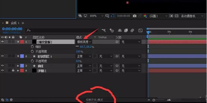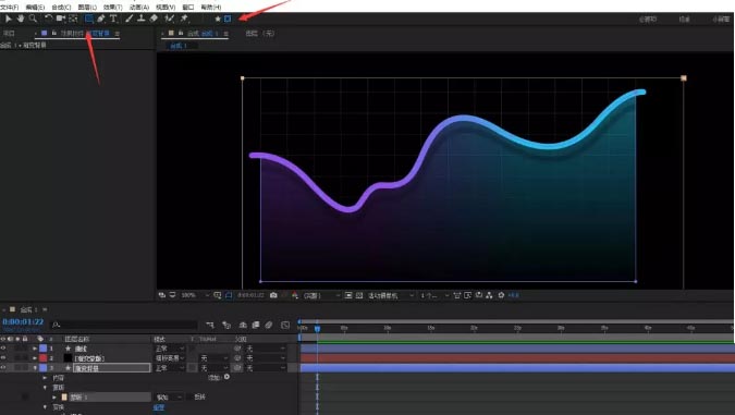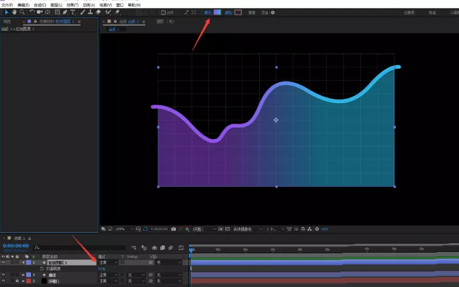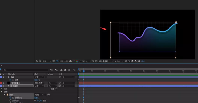 22、展开蒙版,给蒙版路径添加关键帧动画,第一帧移动到左侧,第二个关键帧的时候讲蒙版移动到刚好使得渐变背景完全显示出来