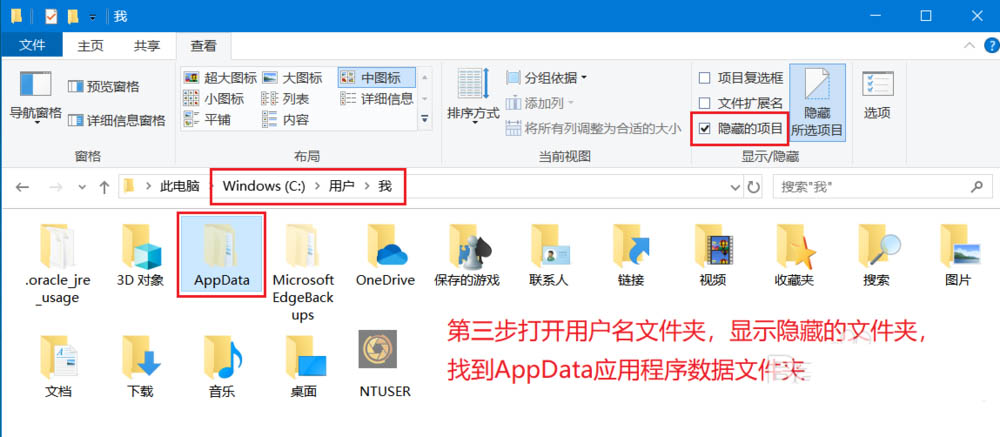 3、打开用户名文件夹,显示隐藏的文件夹,找到AppData文件夹
