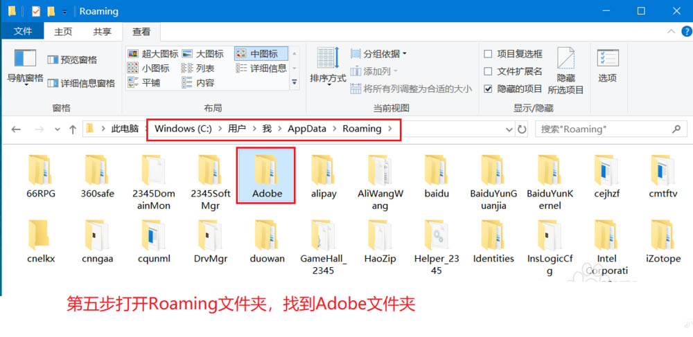 5、打开Roaming文件夹,找到Adobe文件夹