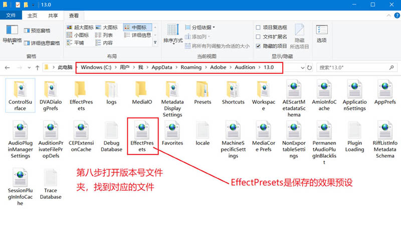 预设文件默认位置为C:\Users\(用户名文件夹每个人的不一样)\AppData\Roaming\Adobe\Audition\13.0(AU版本号文件夹,例如13.0或11.0),预设文件的扩展名.xml的