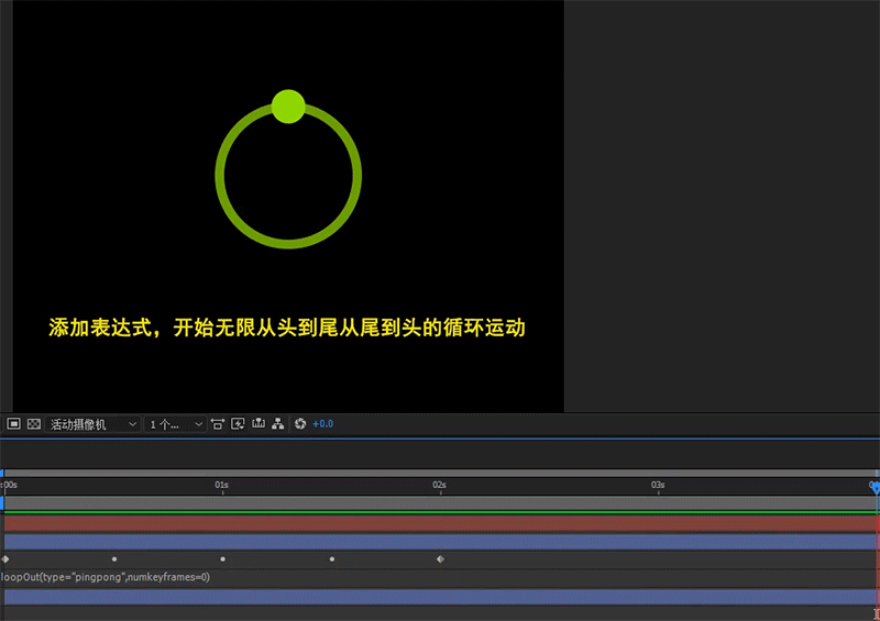 4、选中位置属性按住Alt键添加loopOut(type="pingpong",numkeyframes=0)表达式,我们会发现小球开始无限从头到尾从尾到头的循环运动了;