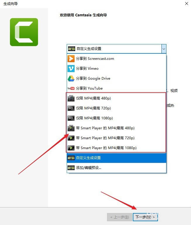 5、选择需要导出的视频样式(例如本文的mp4),选择好以后点下一步。
