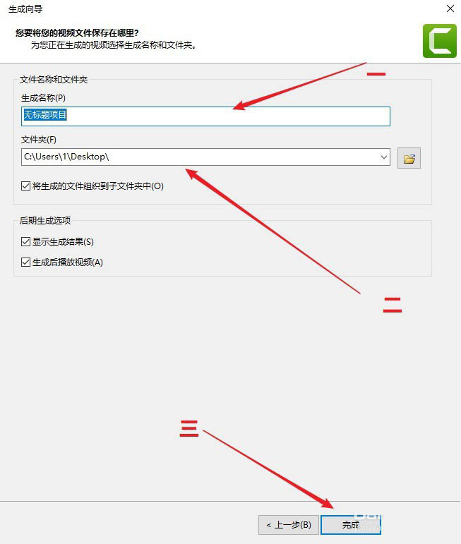 6、选择导出的视频名称与位置,然后点击底部的“完成”即可。