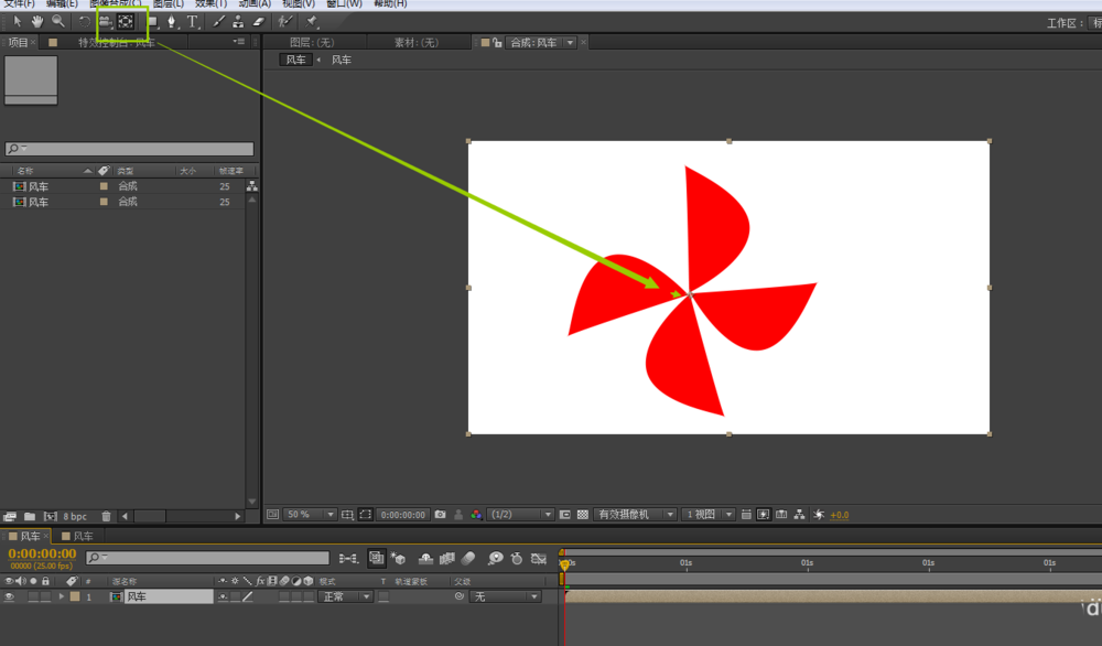 4、这边需要注意的是要将预合成之后的锚点利用锚点工具拖动到风车中心,不然到时候风车就不能绕着中心点旋转了