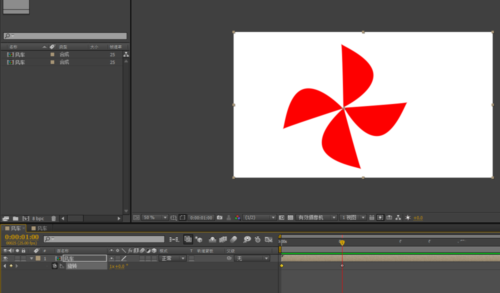5、打开预合成的旋转属性,k两个关键帧,0s处0度,1s处360度或者直接0度(反正要旋转一周),这个时候播放效果,在0-1s内风车是旋转的,但是过了1s之后就停止不动了。