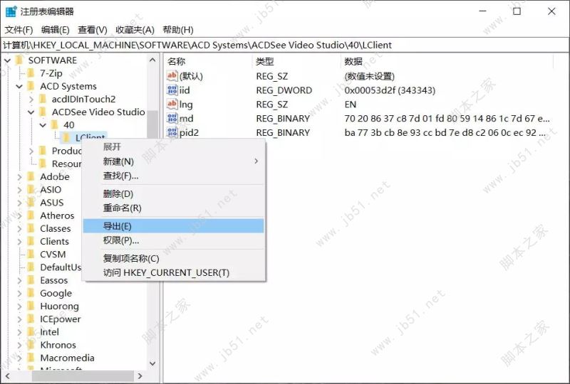 打开注册表编辑器,依次定位到以下目录[HKEY_LOCAL_MACHINE\SOFTWARE\ACDSystems\ACDSeeVideo Studio\40\LClient],并右键导出注册表文件。