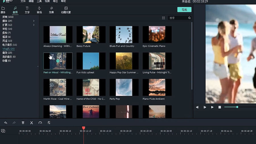 3、没有音乐时可点击“音乐库”,打开喵影工厂的音乐库,将音频拖拽到视频中即可。