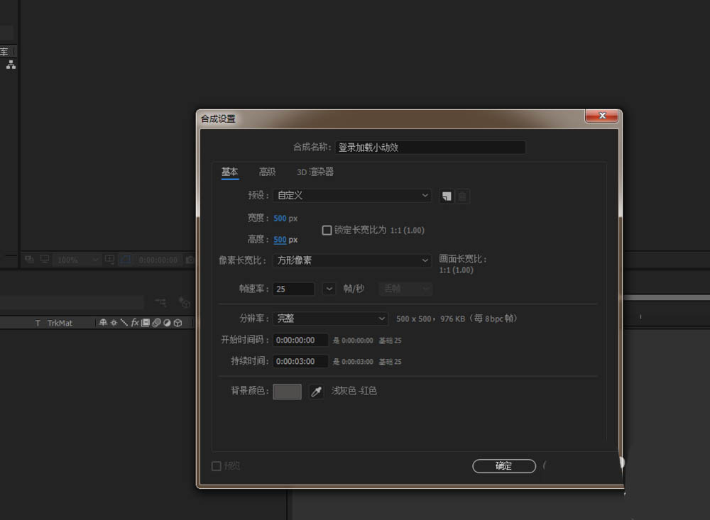 1、打开ae软件,命名登录加载小动效,调整相应的参数。