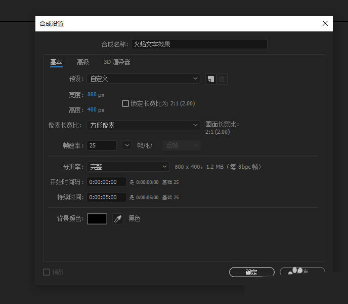 1、打开AE软件,命名火焰文字效果,调整相应的参数。