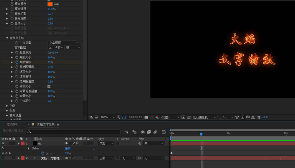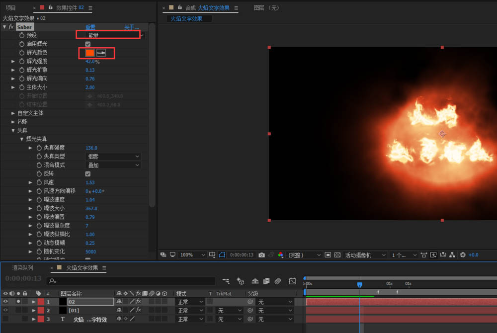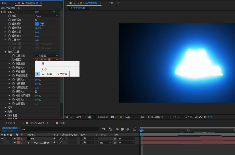 3、ctrl+y新建一个纯色层;命名为01;将文本预合成前面的小眼睛关闭掉隐藏,给纯色层添加saber插件(这是一个外置插件),saber插件比较常用的是用来实现星际里面的激光剑,能量剑等效果;