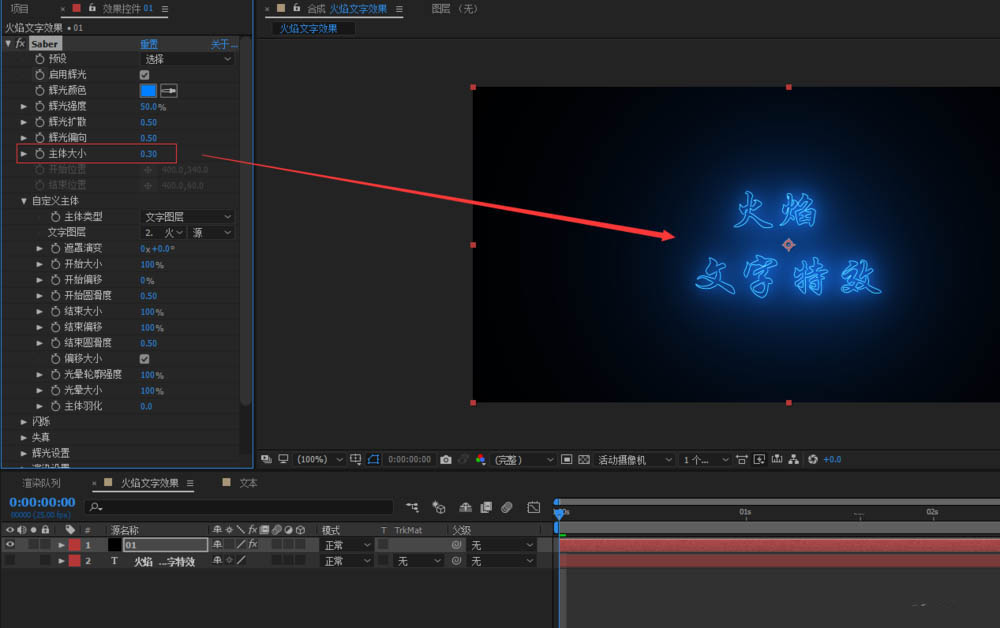 5、选择我们刚刚创建的文字,可以看到中间有过爆的效果,我们把主体大小降低,就可以看到文字部分了;