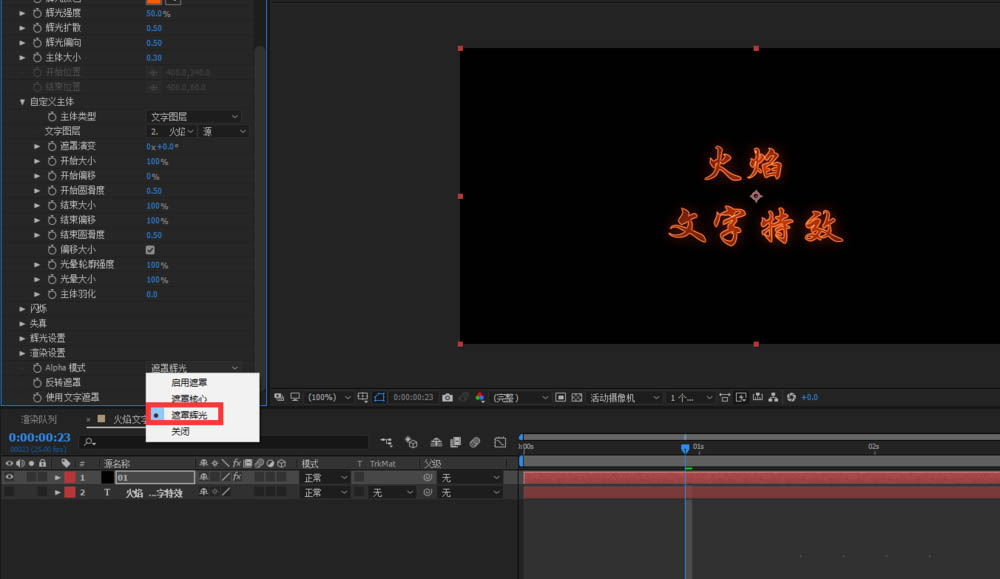 2、渲染设置,Alpha模式,选择遮罩辉光(文字的外侧辉光就会全部消失);(遮罩核心(全部扩散的效果,会有一个模糊的扩散效果),启用遮罩(只保留内侧效果));