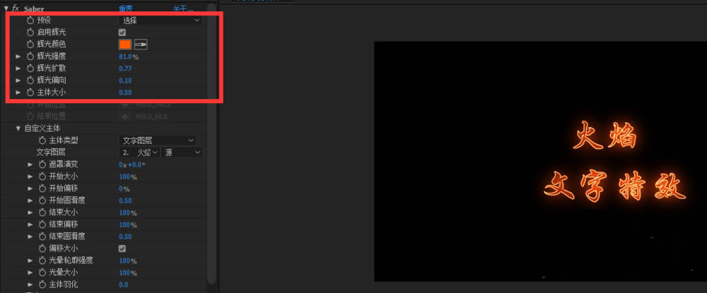3、把辉光程度修改得亮一点,主体大小是对文字边缘的粗细进行控制;如果我们增大了主体大小的话,会有过爆的现象,我们可以通过调节辉光偏向来调整曝光情况;降低辉光扩散的话,文字边缘也是会变得粗起来的;具体参数按实际需要进行相应的调整;