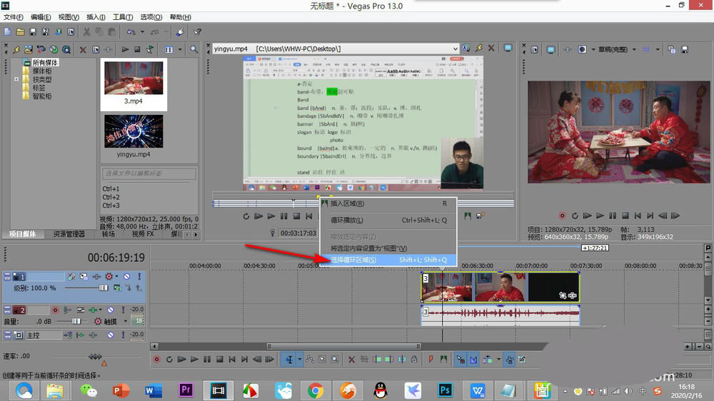 3、将鼠标放在选中区域的位置,鼠标变为横向双向箭头的时候,鼠标右键——选择循环区域。