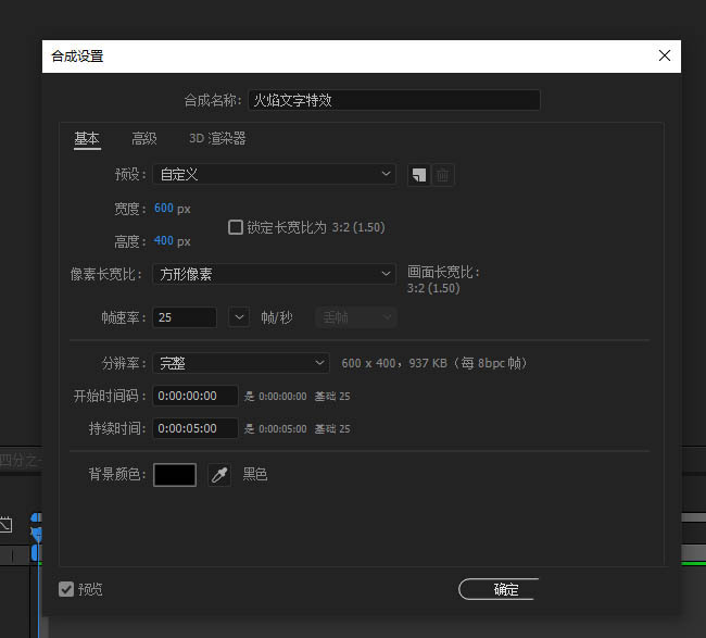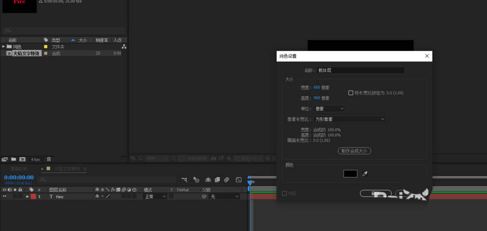 1、打开AE软件,命名火焰文字特效,调整相应的参数。