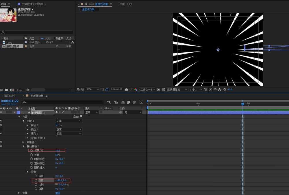 5、添加摇摆变换,添加之后我们需要把摇摆变换拖拽到整个形状的最下面;打开摆动变换里面的变化,调整位置的x轴数值,我们按下空格键进行预览播放就能看到相应的效果了;(可以通过调整摆动变化的摇摆数值来调整自己想要的速度,可以通过调整形状的变换里面的位置的x轴数值来调整速度线的扩散程度;)