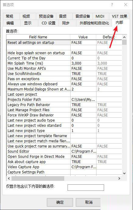 二、在“首选项”面板中,可以发现多出了一个“内部”的标签页,选择它,如下图所示: